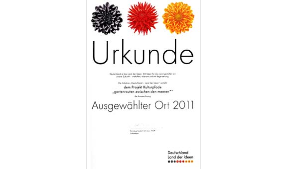Die gartenrouten zwischen den meeren* sind „Ausgewählter Ort 2011“ im Wettbewerb „365 Orte im Land der Ideen“ und waren Partnerprojekt der "igs hamburg 2013"